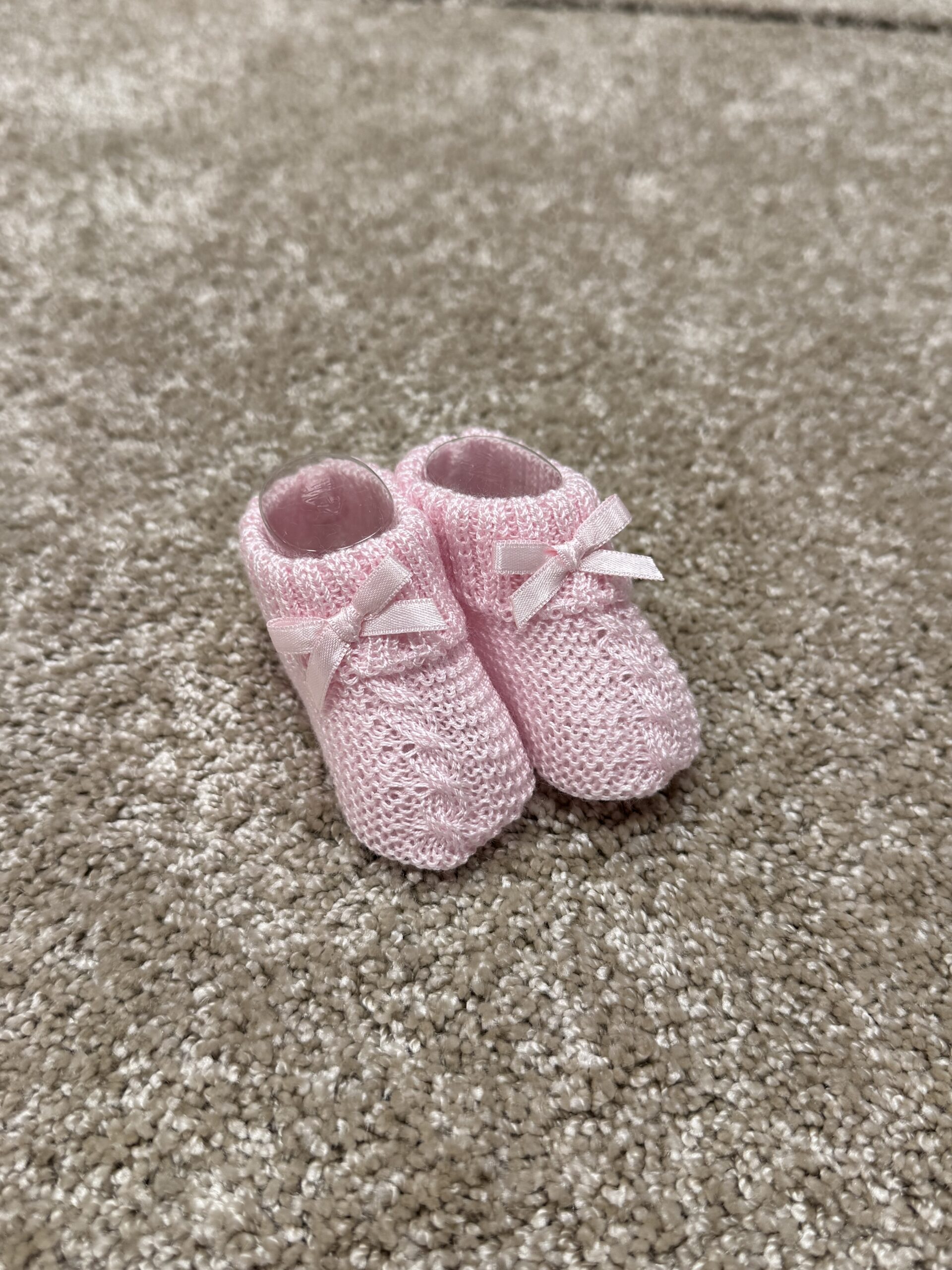 Disse nydelige baby tøfler i perlé med sløyfe er både praktiske og elegante. De er strikket i mykt og pustende perlé-materiale som holder babyens føtter behagelig varme uten å bli for varme. Sløyfedetaljen foran gir et klassisk og søtt uttrykk som passer til både hverdags og spesielle anledninger. Baby tøfler er et ideelt valg for å fullføre antrekket til de minste, og de finnes i flere delikate farger.
