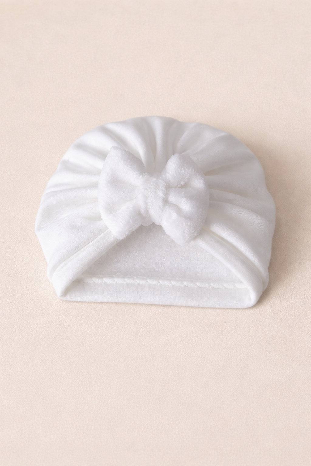 En nydelig og myk turbanlue til baby, designet med en søt sløyfe foran som gir et klassisk og elegant uttrykk. Den myke og elastiske kvaliteten gjør at luen sitter godt og komfortabelt på babyens hode uten å stramme.