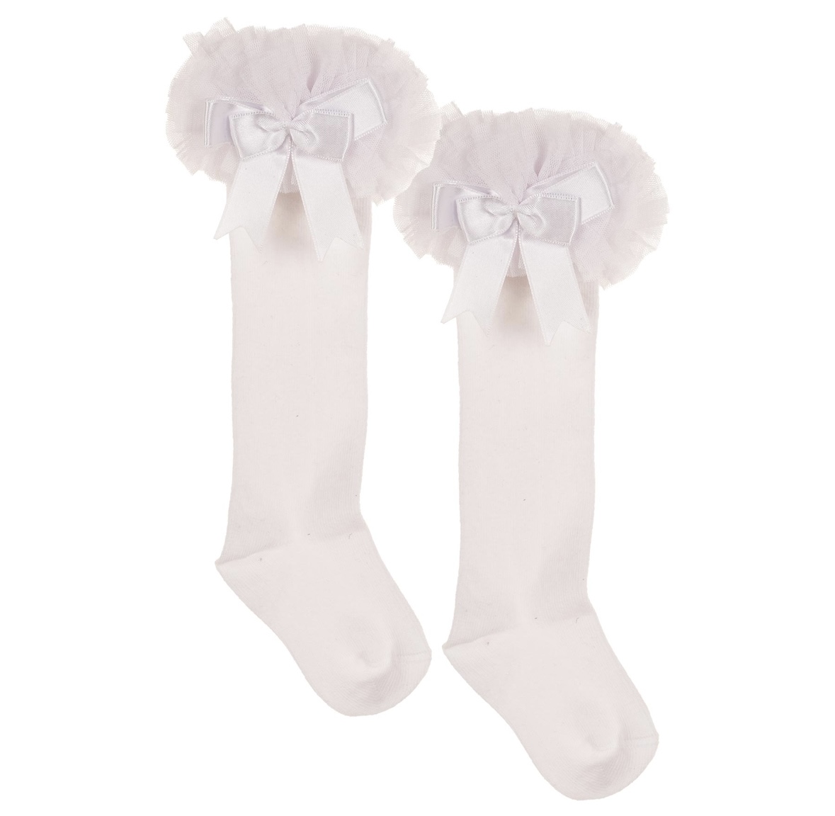 Babyknestrømper med tyll og satengsløyfe gir antrekket et søtt og stilfullt preg. De er laget i myk bomull og har en vakker tyllkant kombinert med satengsløyfe som gjør dem perfekte til både dåp, fest og hverdagsbruk. Komfortable og elastiske, slik at de sitter godt på små ben hele dagen.