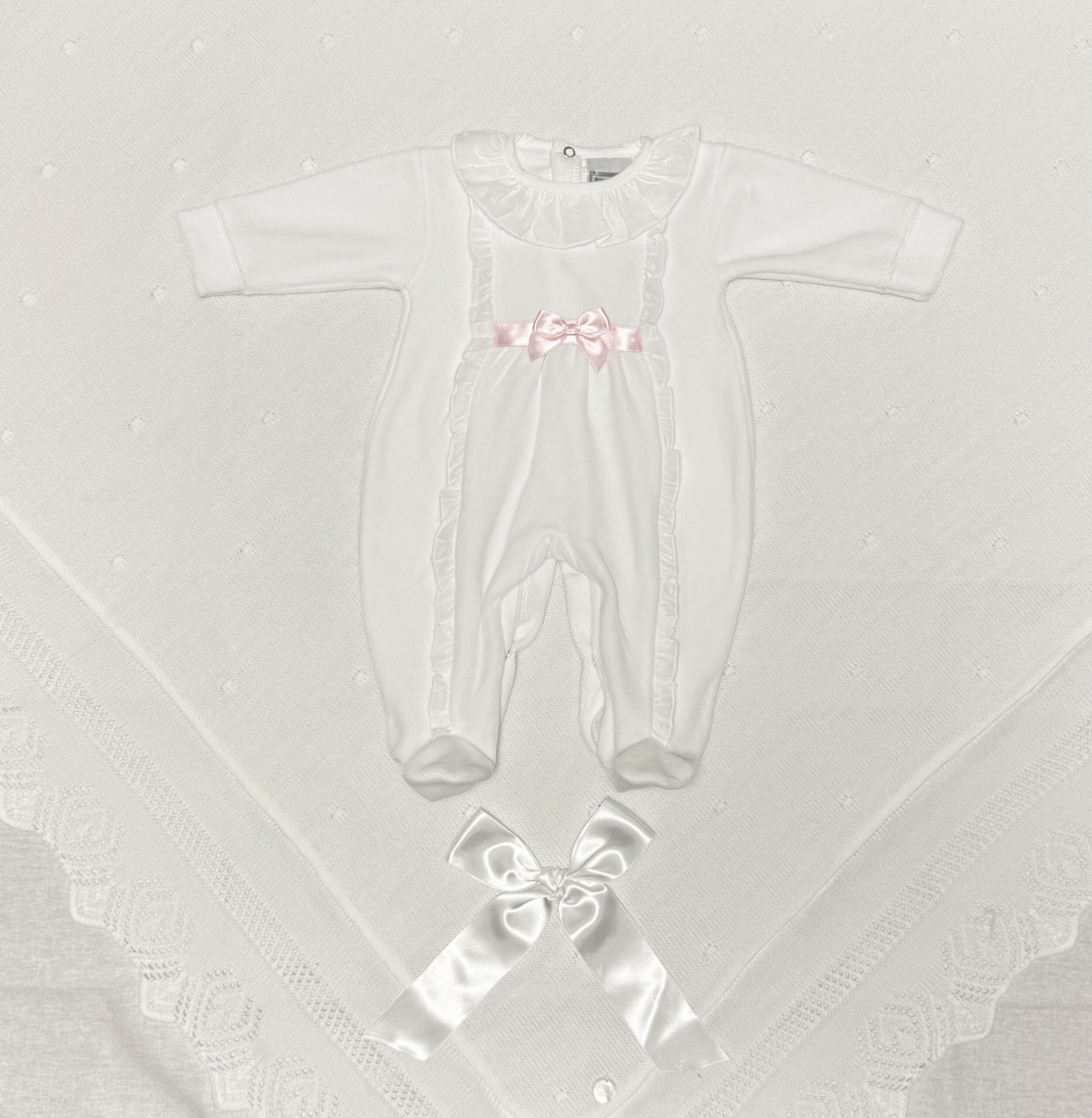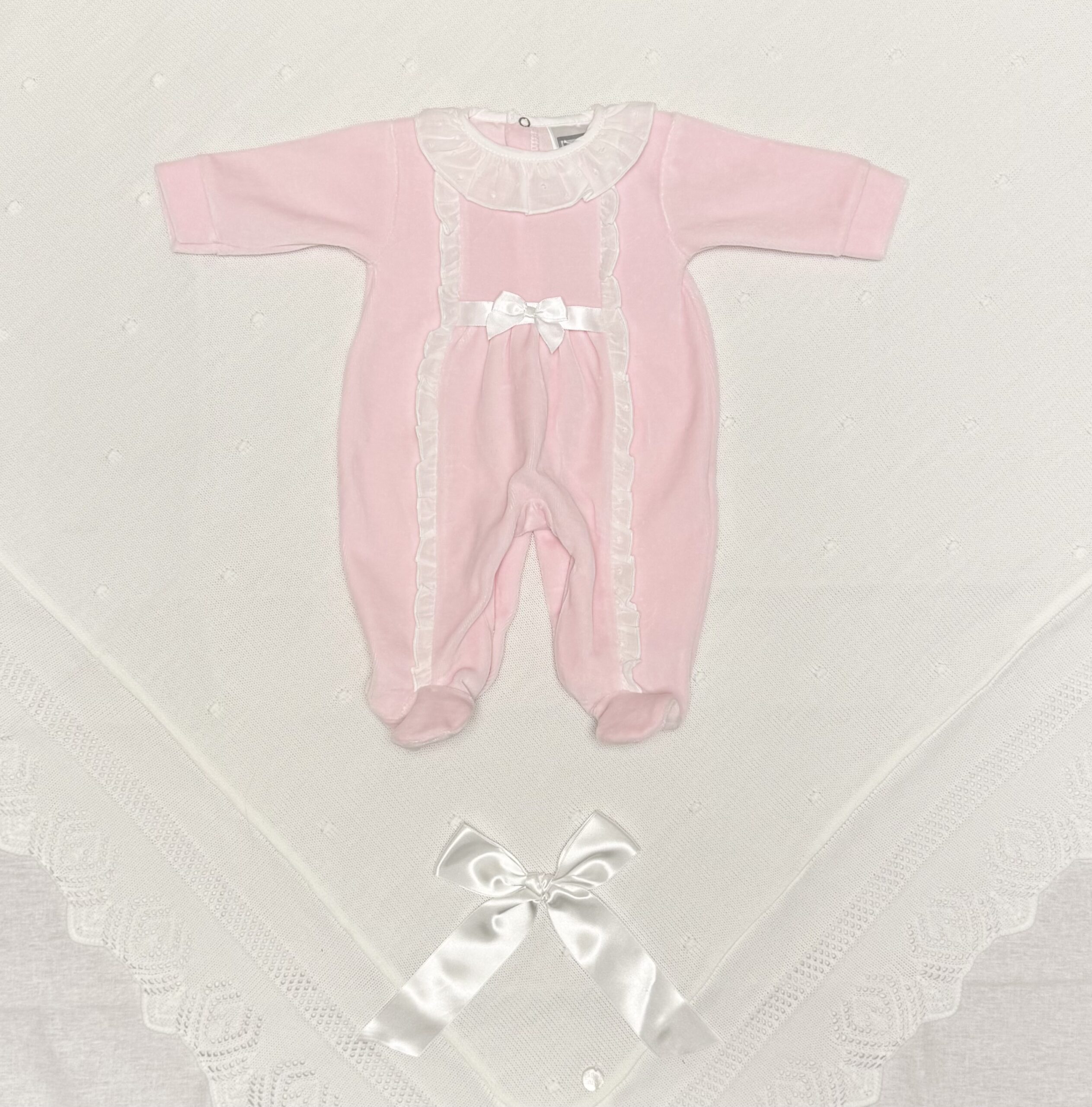 Nydelig babysparkedress laget i myk velour som gir både komfort og varme til de små. Sparkedressen har delikate hvite blondedetaljer langs fronten og kragen, samt en søt satengsløyfe i midjen som gir et ekstra sjarmerende preg. Praktiske trykknapper gjør den enkel å ta av og på, perfekt både til hverdagsbruk og spesielle anledninger.