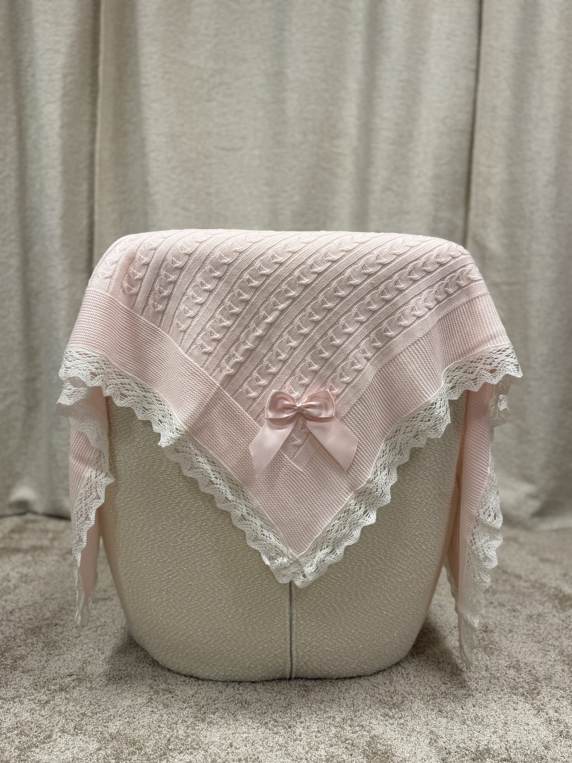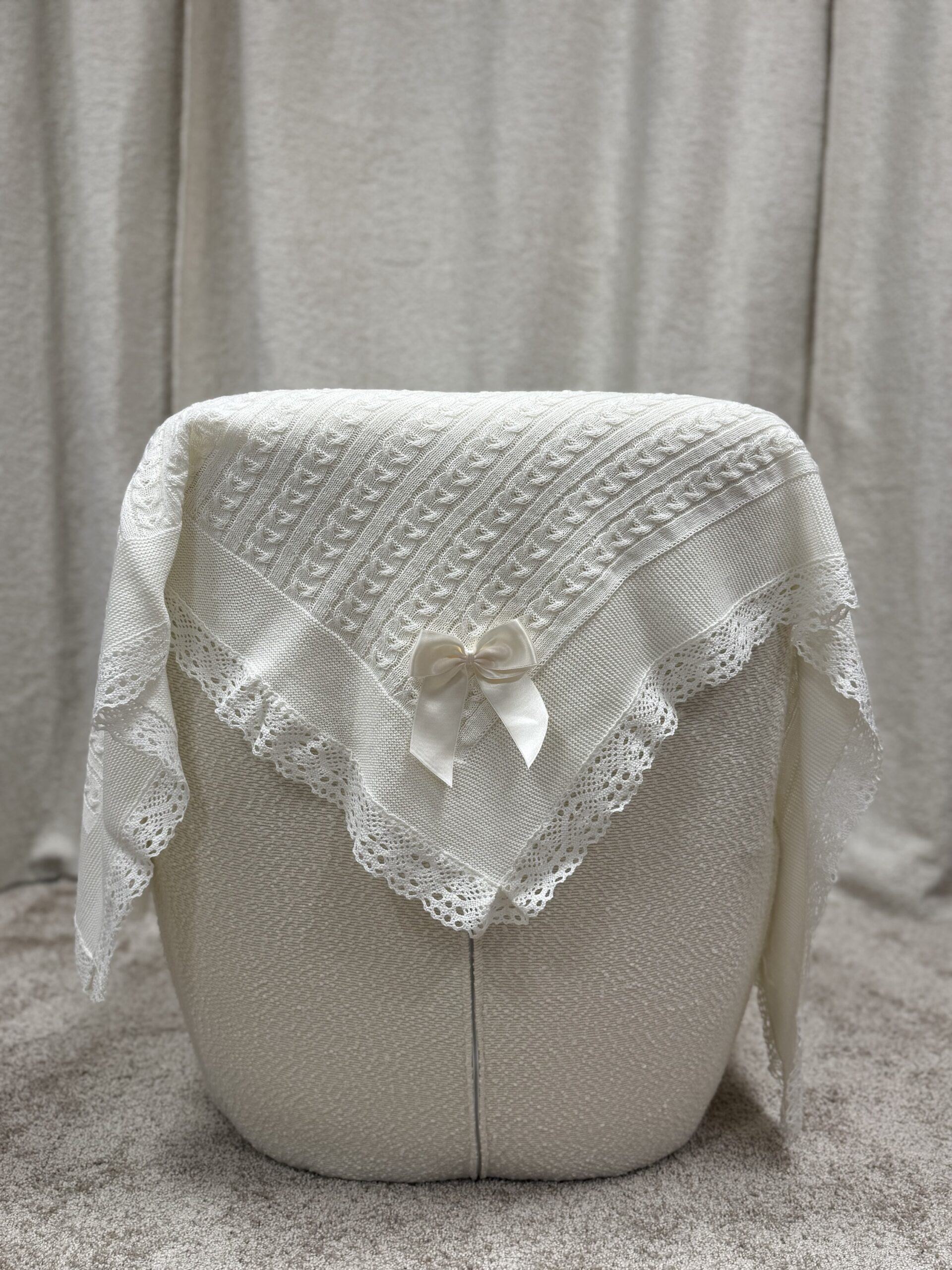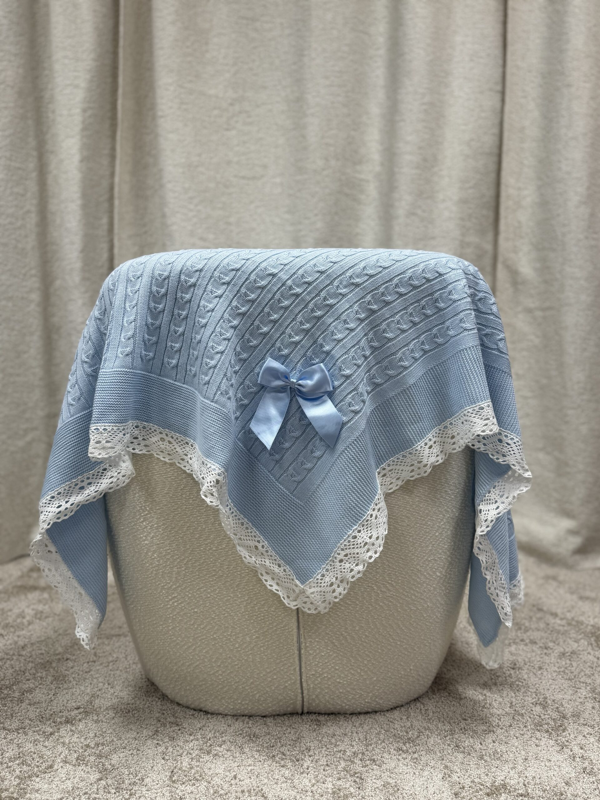 Nydelig babyteppe i myk strikket bomullsblanding med dekorativ satengsløyfe og blondekant. Teppet har en lun og behagelig kvalitet som gjør det perfekt til både hverdagsbruk og spesielle anledninger, som dåp eller gave til nyfødt. Med størrelsen 110×110 cm passer det fint i barnevogn, sprinkelseng eller som et koseteppe.