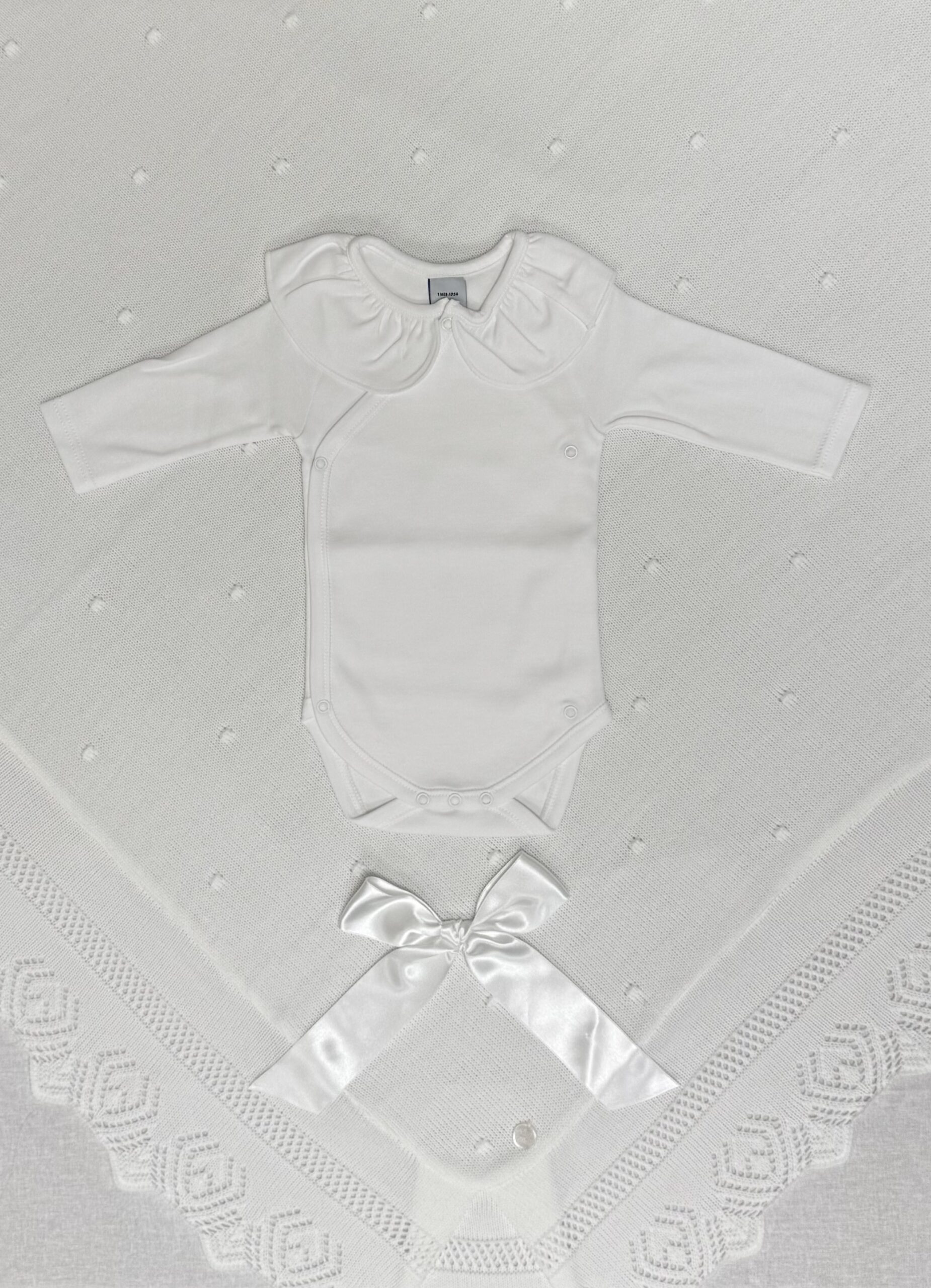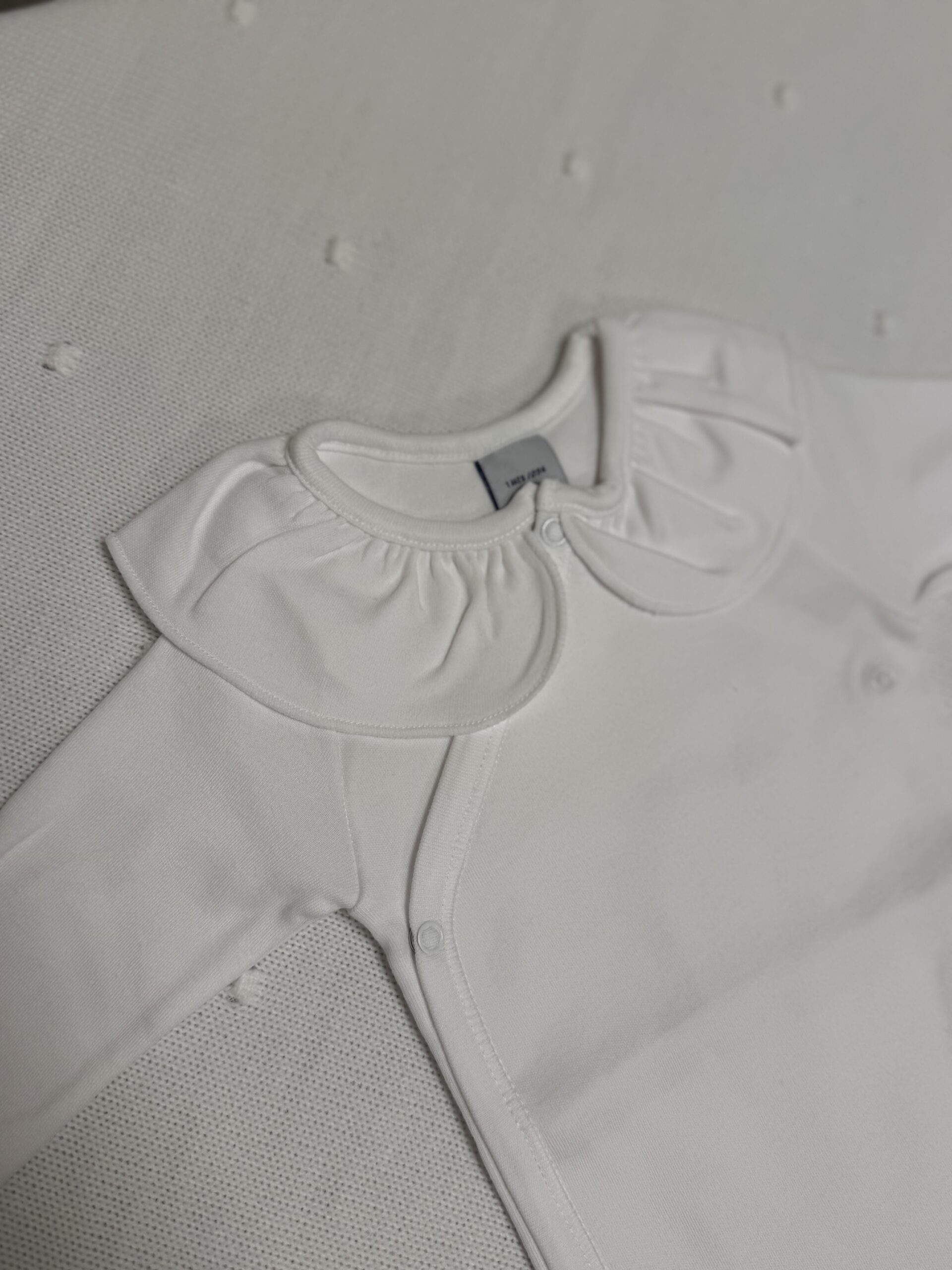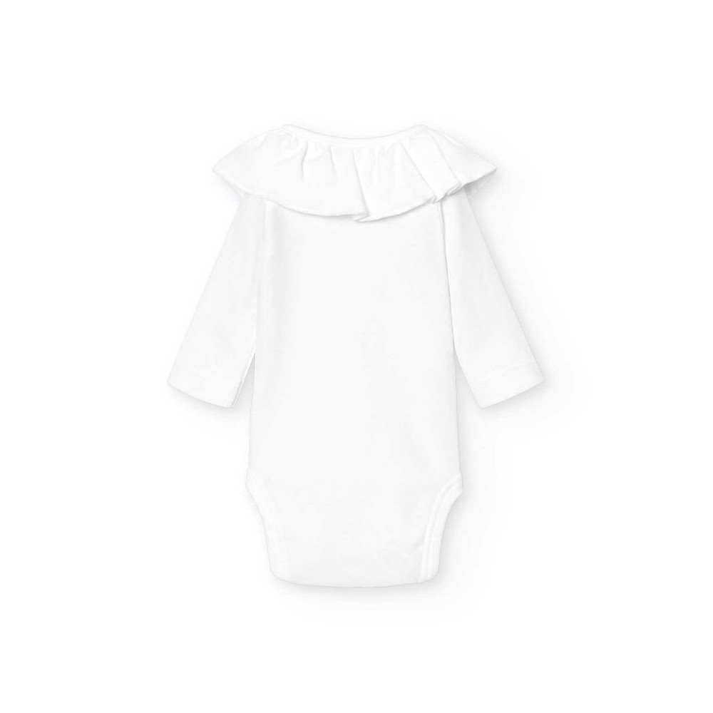 Hvit body i bomullsjersey til babyjenter fra Babidu, med en fin rysjekrage. Den har brukervennlige trykknapper foran og mellom bena for enkel påkledning og for å sikre at den holder seg pent gjemt inn.