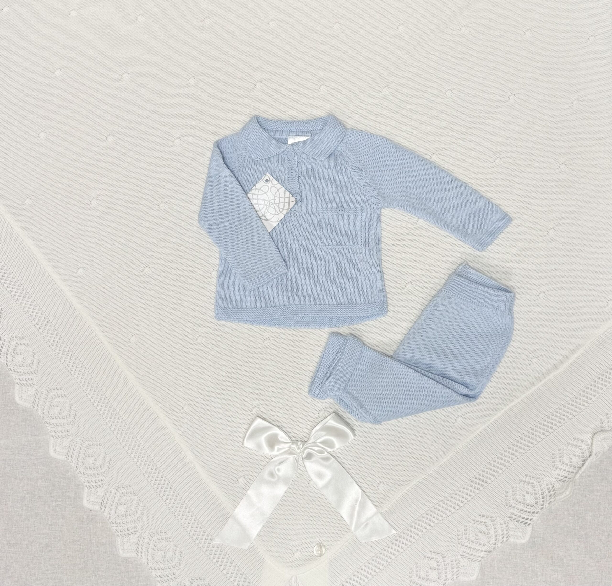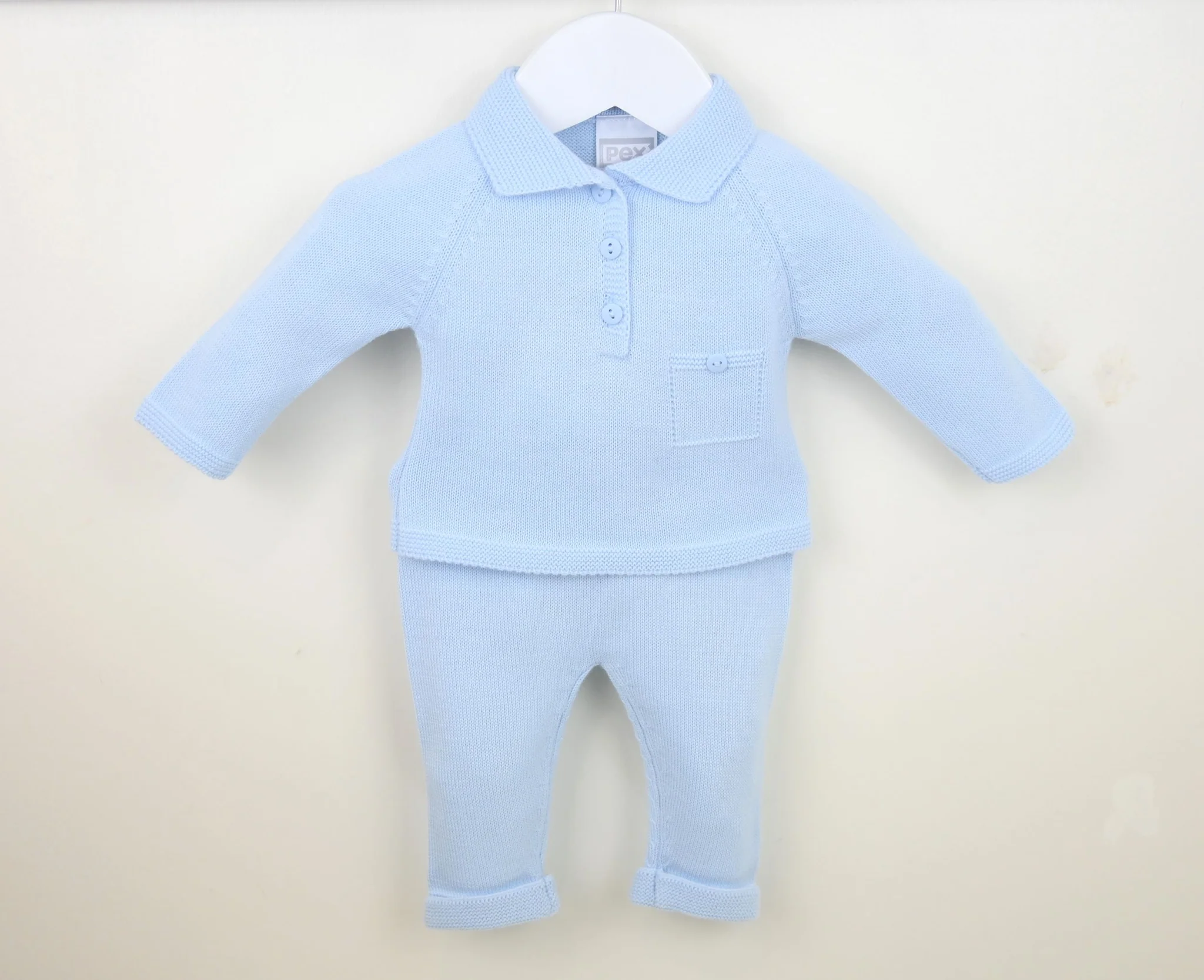 Oliver polo collar suit blue kombinerer klassisk design med komfort for de minste. Den myke strikkede overdelen har en tidløs poloskjorte-krage, knappelukking og dekorativ brystlomme som gir et stilrent uttrykk. De matchende buksene har oppbrettede mansjetter og elastisk liv for en behagelig passform som følger babyens bevegelser. Et komplett babysett som passer like godt til hverdagsbruk som til spesielle anledninger.