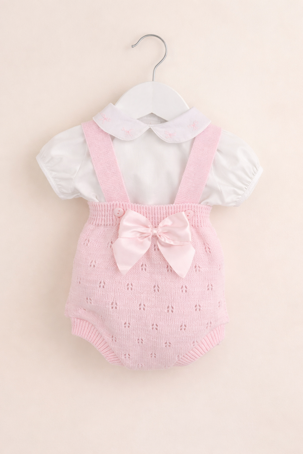 Et nydelig og klassisk babysett i myk rosafarge – perfekt til små prinsesser. Settet består av en hvit bluse med en søt krage med delikat broderi, kombinert med en strikket rosa bloomer med seler og en vakker satengsløyfe bak.