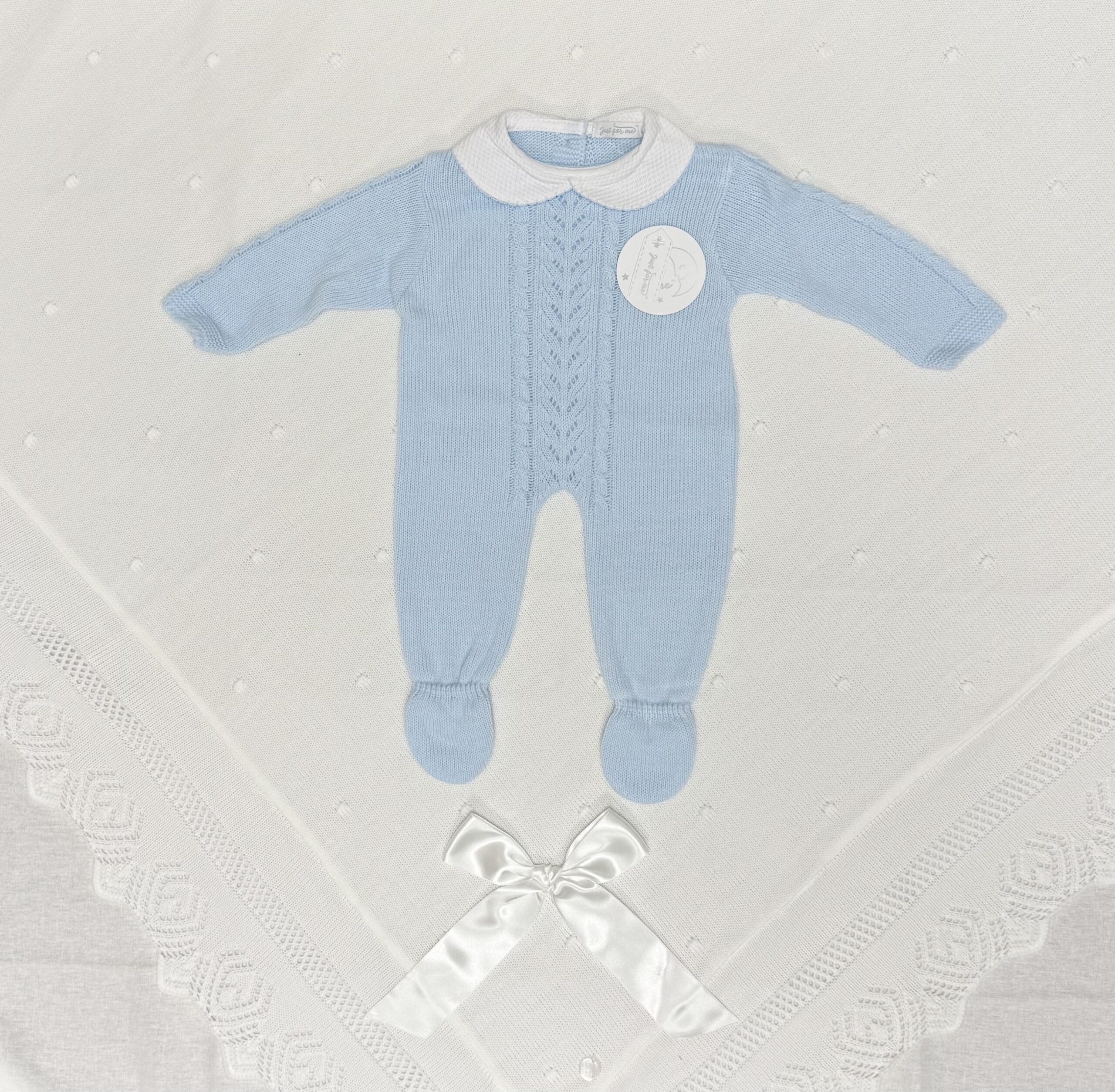 En klassisk og tidløs heldress for små gutter, strikket i mykt materiale med delikate mønsterdetaljer foran. Den hvite kragen gir et søtt og stilig uttrykk, mens det strikkede designet gjør plagget lunt og behagelig – perfekt for kjølige dager.