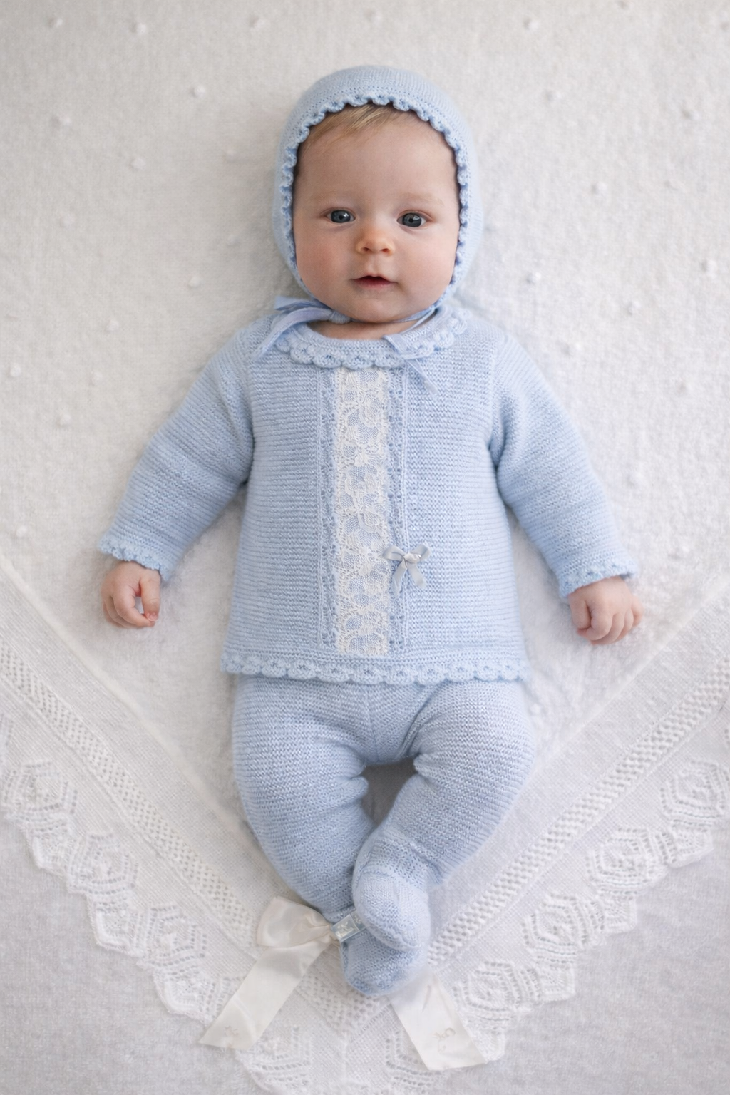 Settet består av en myk strikkegenser med romantisk blondepanel foran, søte bølgekantsdetaljer og en liten satengsløyfe. Matchende fotbukse og kyse følger med – en komplett og gjennomført look fra topp til tå.