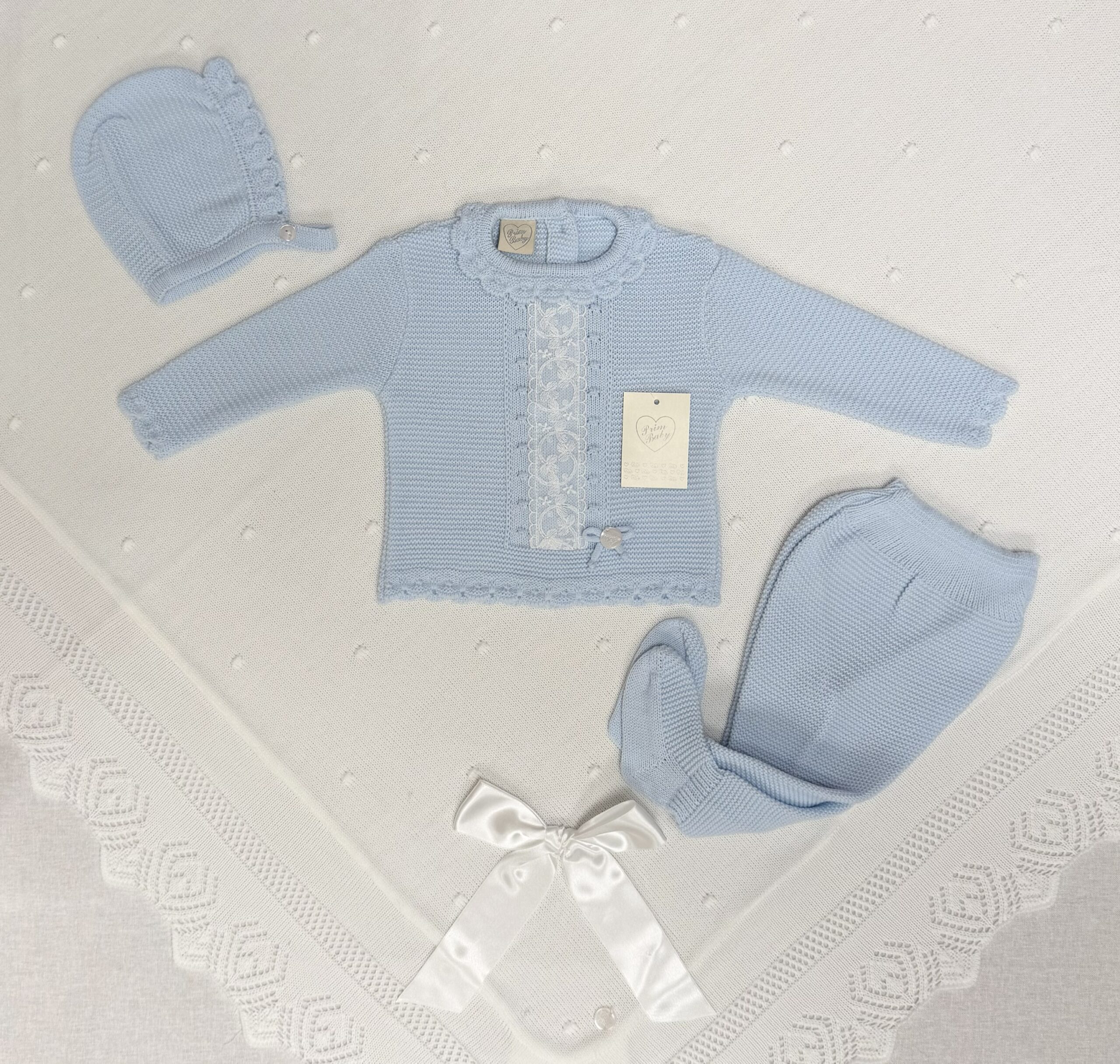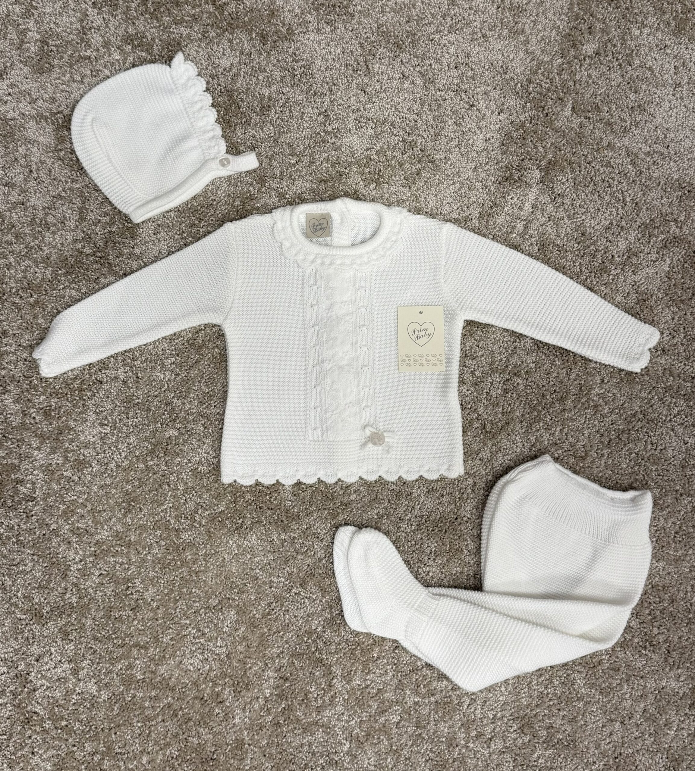 Dette vakre, tidløse strikkesettet fra Prim Baby er perfekt for deg som elsker klassisk babystrikk med delikate detaljer.
