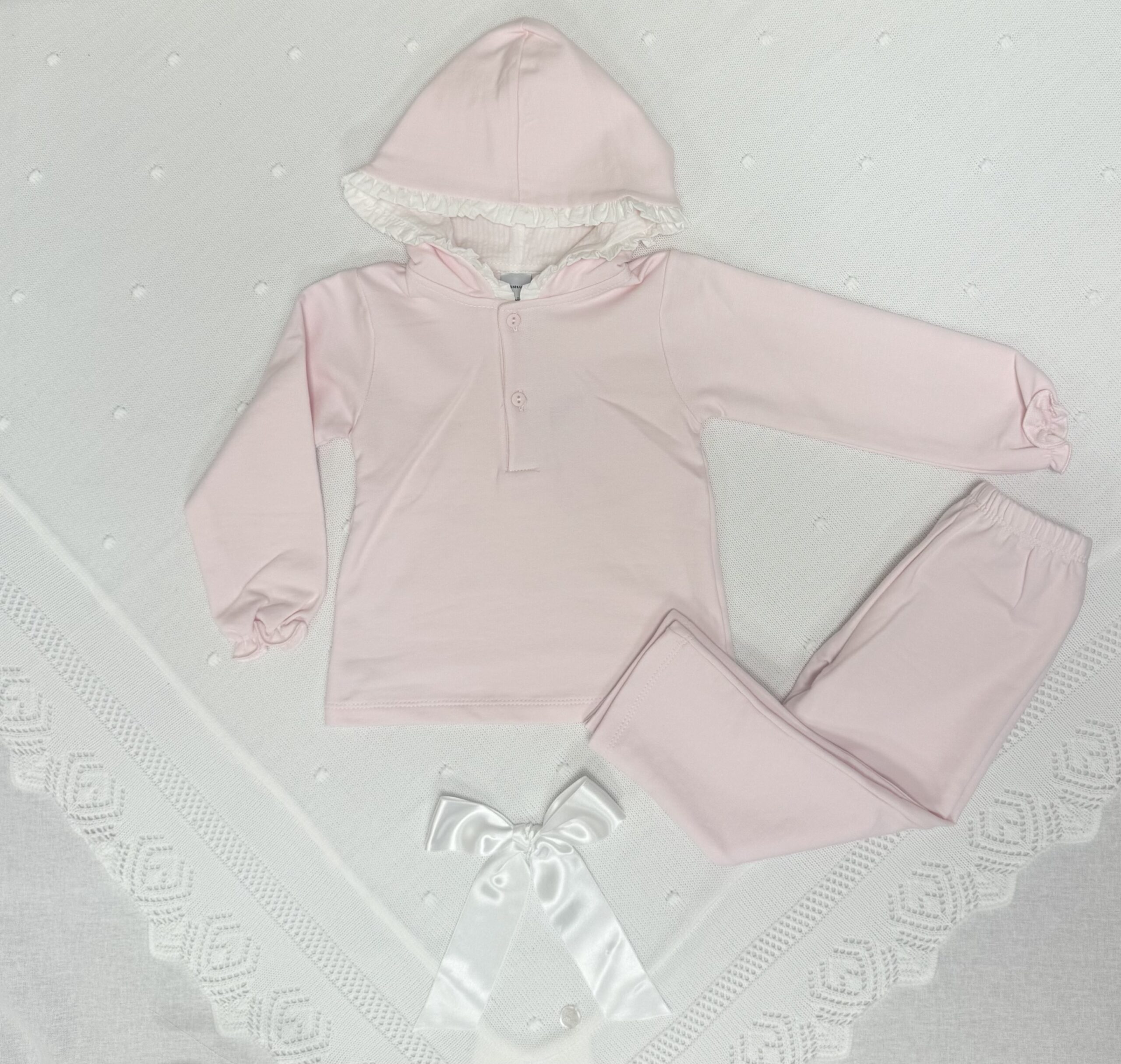 Et skjønt og behagelig todelt sett fra Babidu i myk rosa bomull. Genseren har en søt hette med delikat hvit volangkant og små rynkedetaljer på ermene – perfekt kombinasjon av komfort og eleganse. Buksen har elastisk midje for god passform og bevegelsesfrihet.